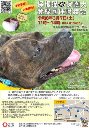 埼玉県動物指導センターにて、犬・猫の殺処分を減らすための取り組みとして、登録団体による「保護猫&保護犬の譲渡会」が開催されます。