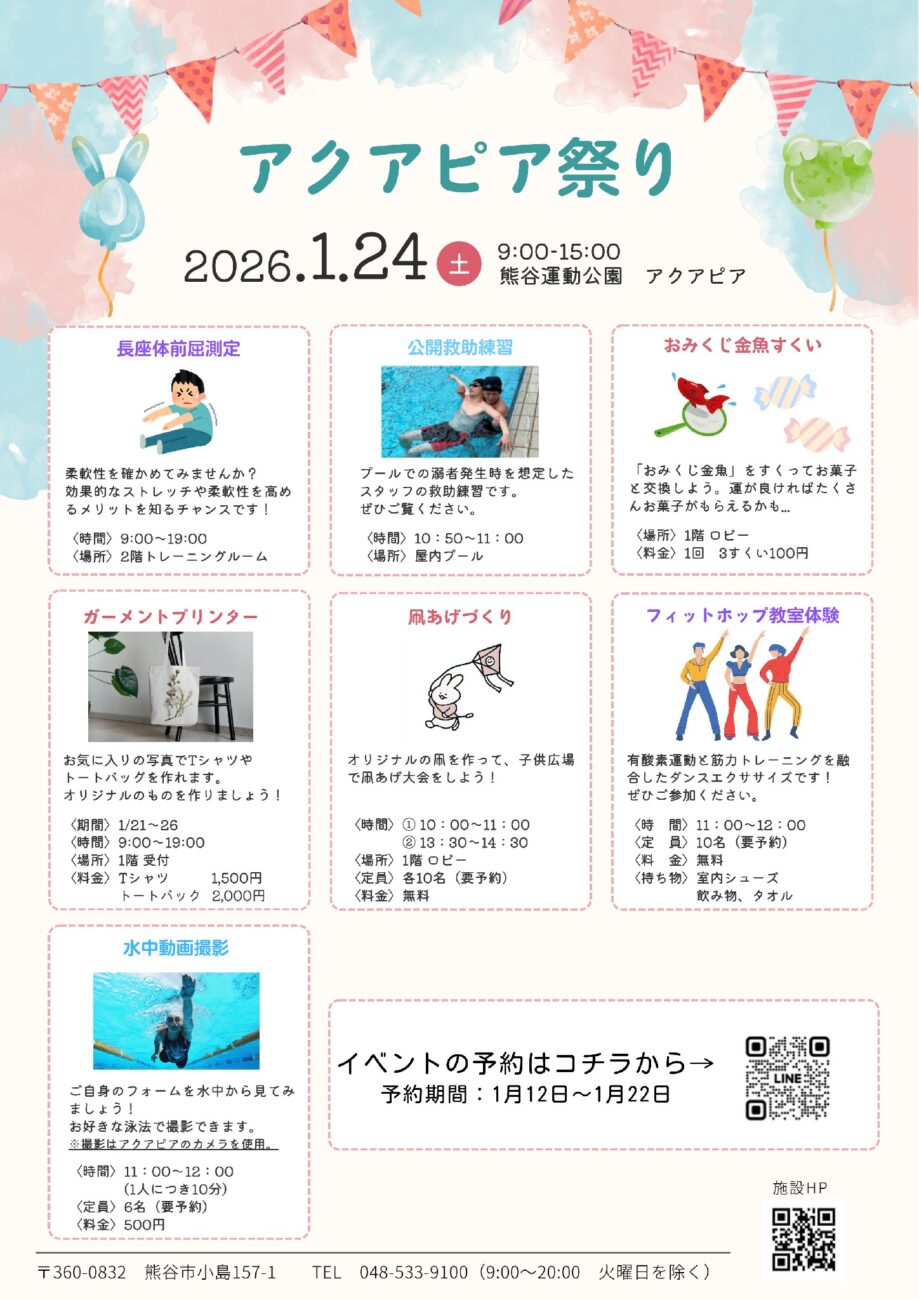長座体前屈測定や公開救助練習、おみくじ金魚すくいなどが予定されています。