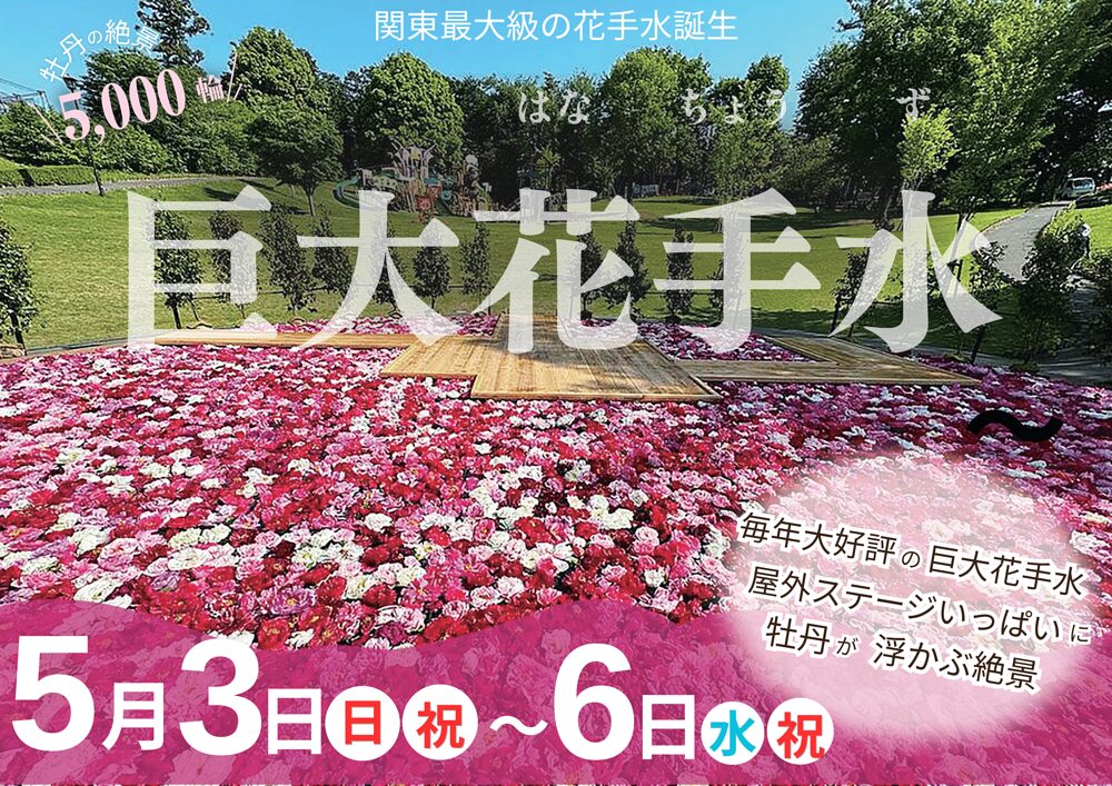 東松山ぼたん園で「巨大花手水」が公開されます。2026年5月3日~5月6日