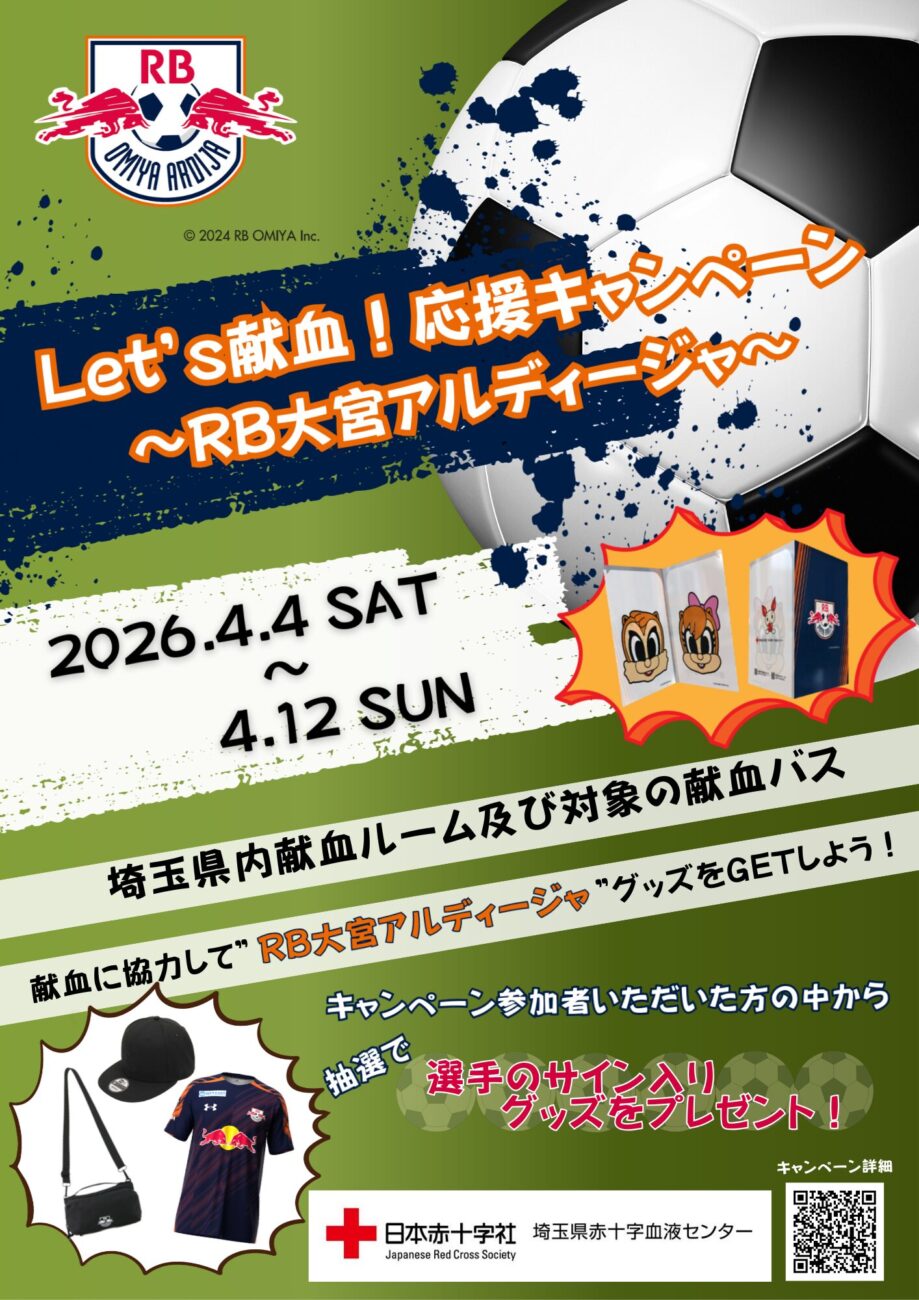 埼玉県内の献血ルームで「Let’s献血!応援キャンペーン2026 ~RB大宮アルディージャ~」が開催されます。