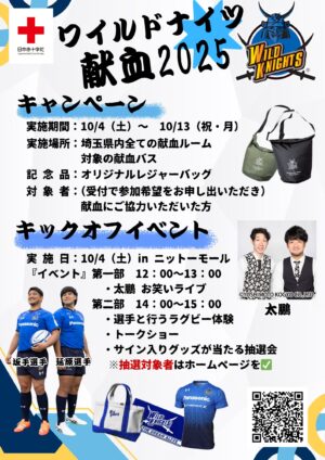 埼玉県内の献血ルームで「ワイルドナイツ献血2025」が開催されます。