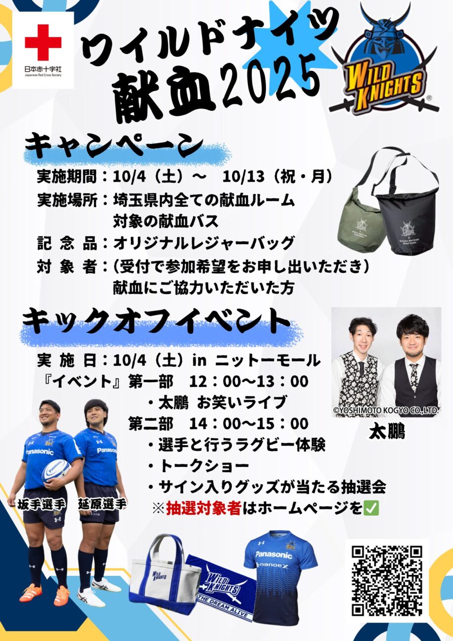 ニットーモールで「ワイルドナイツ献血2025」のキックオフイベントが開催されます。出典:埼玉県赤十字血液センターイベント詳細開催日 :2025年10月4日(土曜日)献血受付時間 :10:00~16:30場所 :ニットーモール ...