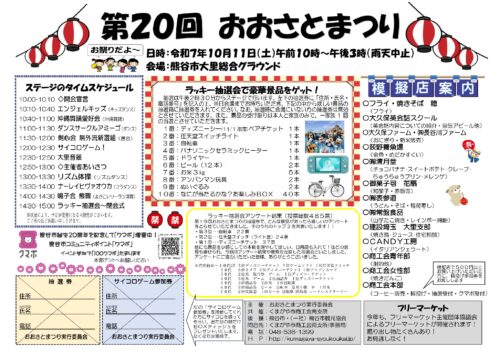 大里総合グラウンドで「第20回 おおさとまつり」が開催されます。2025年10月11日