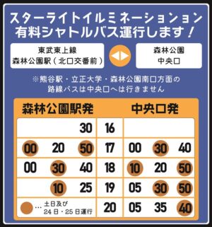 紅葉見ナイト期間中は、森林公園駅と中央口を結ぶ夜間シャトルバス(有料)が運行しています。