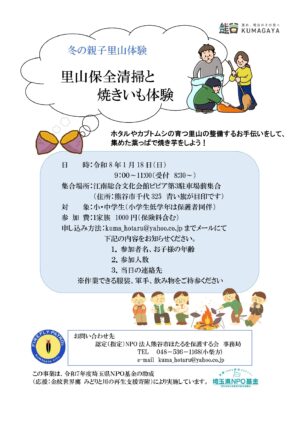 ホタルやカブトムシの育つ里山の整備するお手伝いをして、集めた葉っぱで焼き芋をしよう!
