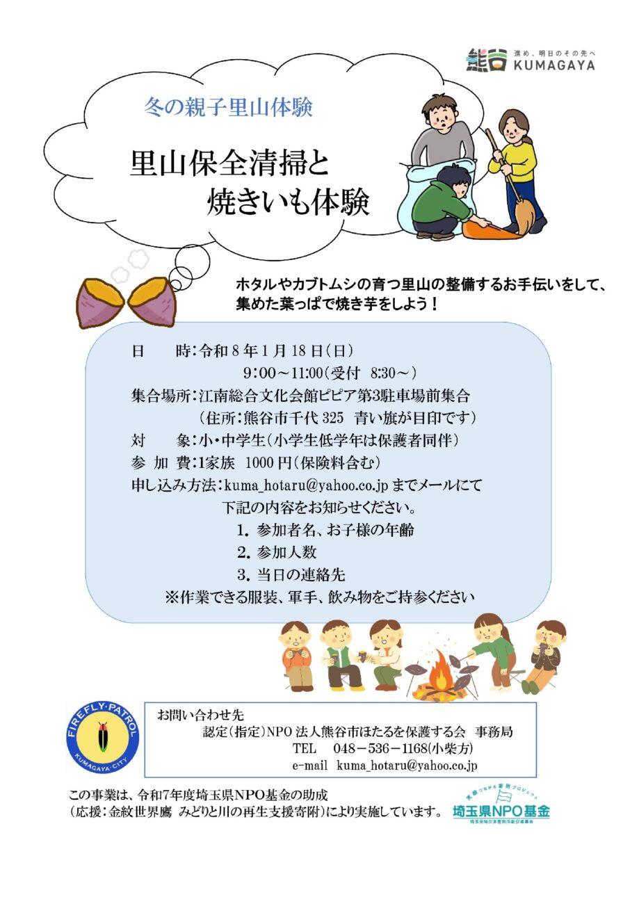 ホタルやカブトムシの育つ里山の整備するお手伝いをして、集めた葉っぱで焼き芋をしよう!