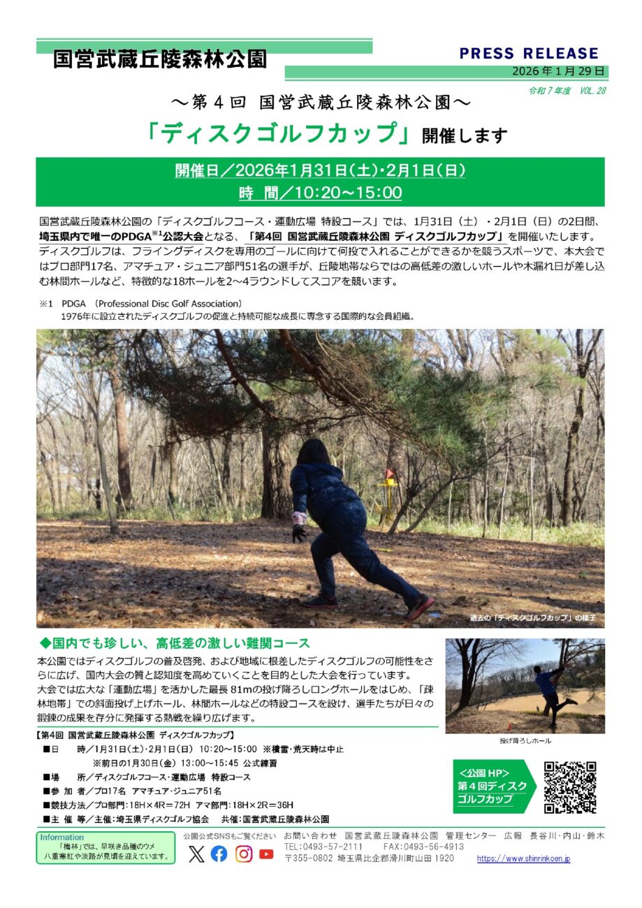 森林公園で「第4回 国営武蔵丘陵森林公園 ディスクゴルフカップ」が開催されます。2026年1月31日~2月1日