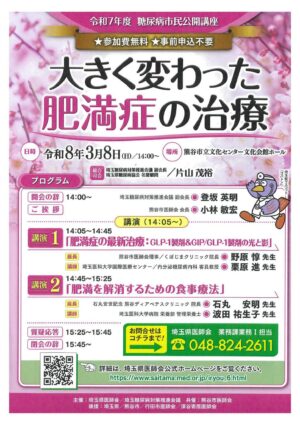 熊谷市立文化センターで「【令和7年度糖尿病市民公開講座】大きく変わった肥満症の治療」が開催されます。