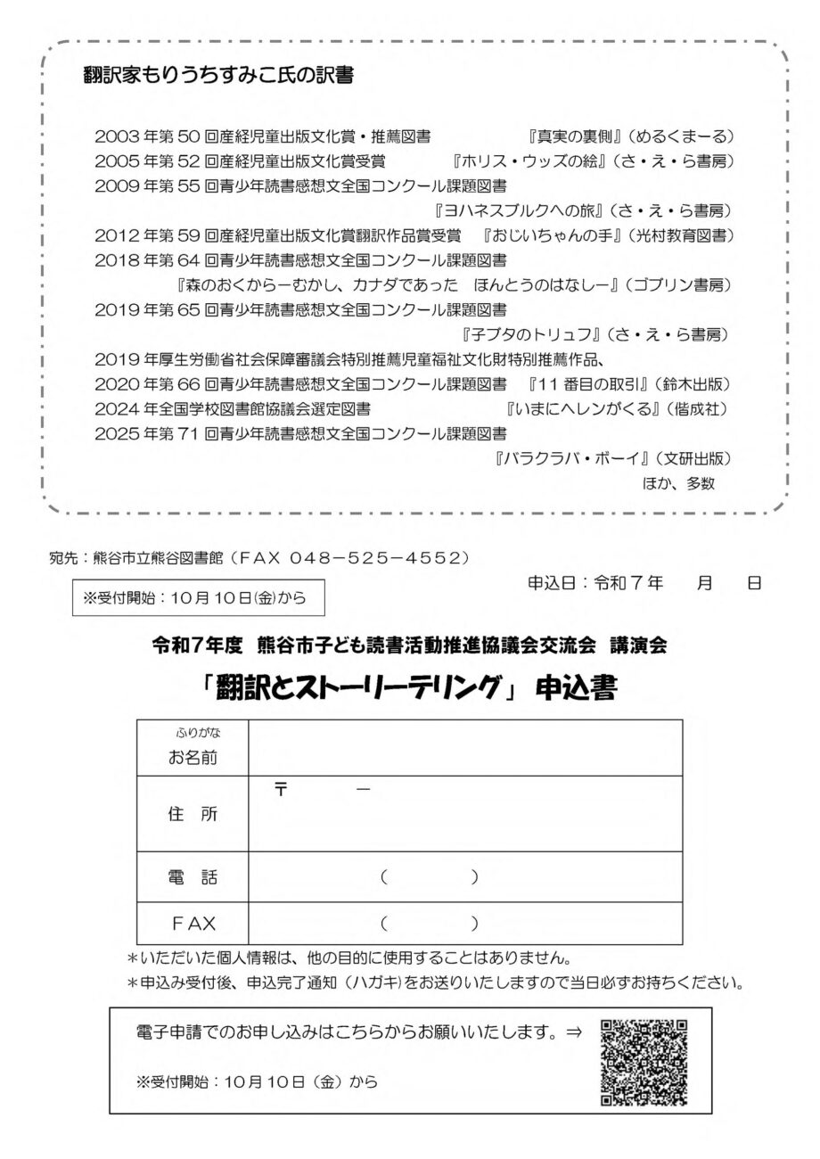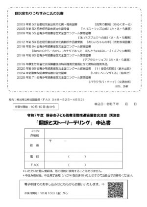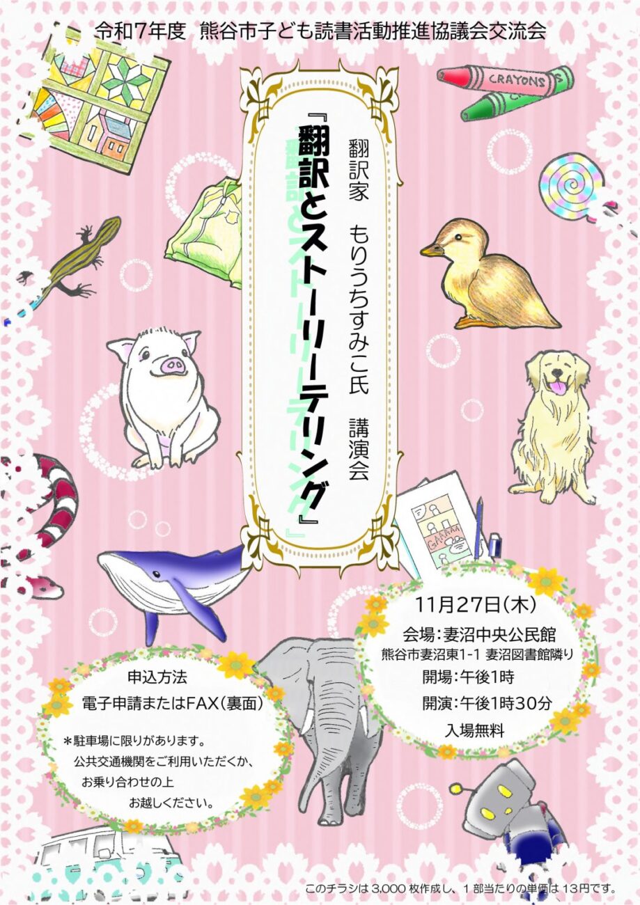 妻沼中央公民館で、翻訳家のもりうちすみこさんによる講演会「翻訳とストーリーテリング」が開催されます。