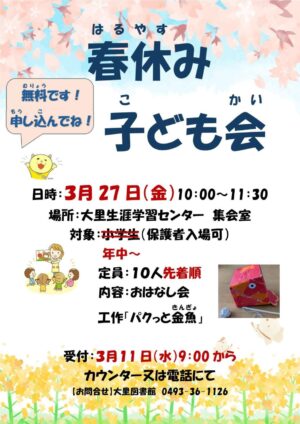 市立大里図書館で「春休み子ども会」が開催されます。
