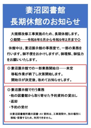 市立妻沼図書館が長期休館します。2026年5月1日~2027年2月ごろまで