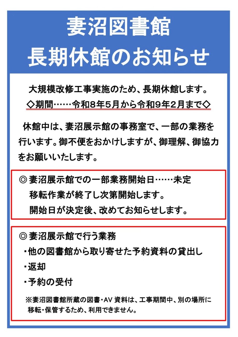 市立妻沼図書館が長期休館します。2026年5月1日~2027年2月ごろまで