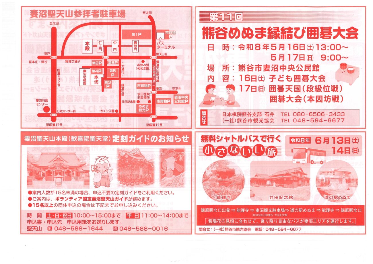 妻沼聖天山で「春季大祭」が4月18日~19日に開催されます。写真提供:熊谷市国宝指定されている聖天山にお邪魔しました。地図はこちら↓埼玉県熊谷市妻沼1511熊谷駅からバスで30分ほど駐車場もあります。場内に春季大祭の表示が出ていました。妻沼...