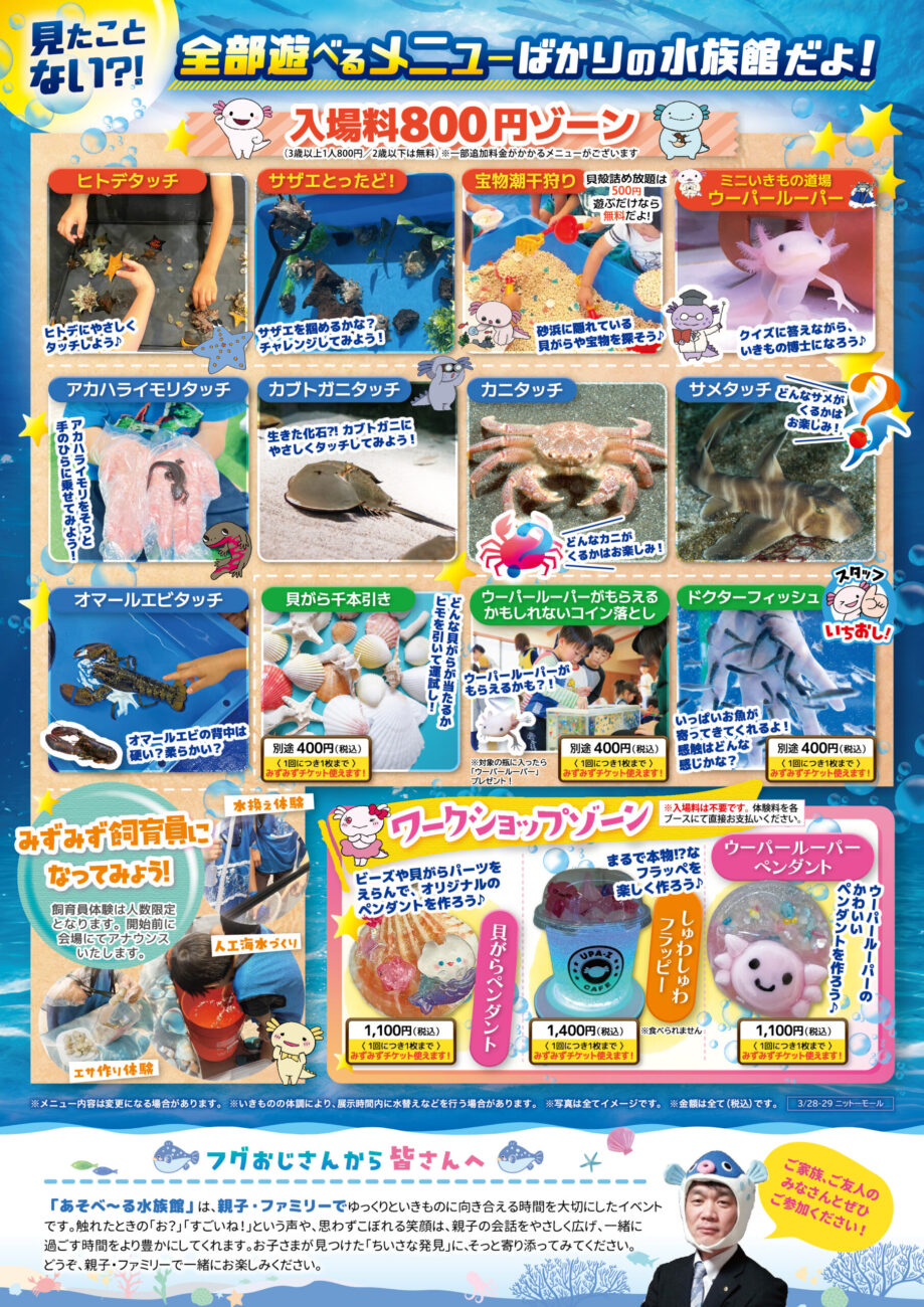 ニットーモールで「あそべ~る水族館」が開催されます。2026年3月28日~29日