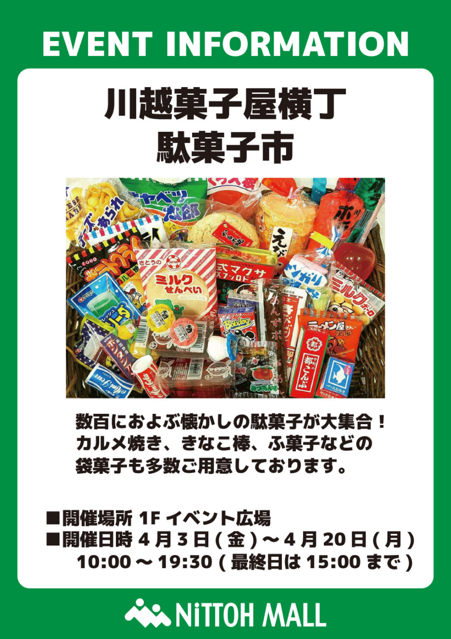 ニットーモールに「川越駄菓子屋横丁 駄菓子市」が期間限定で出店します。