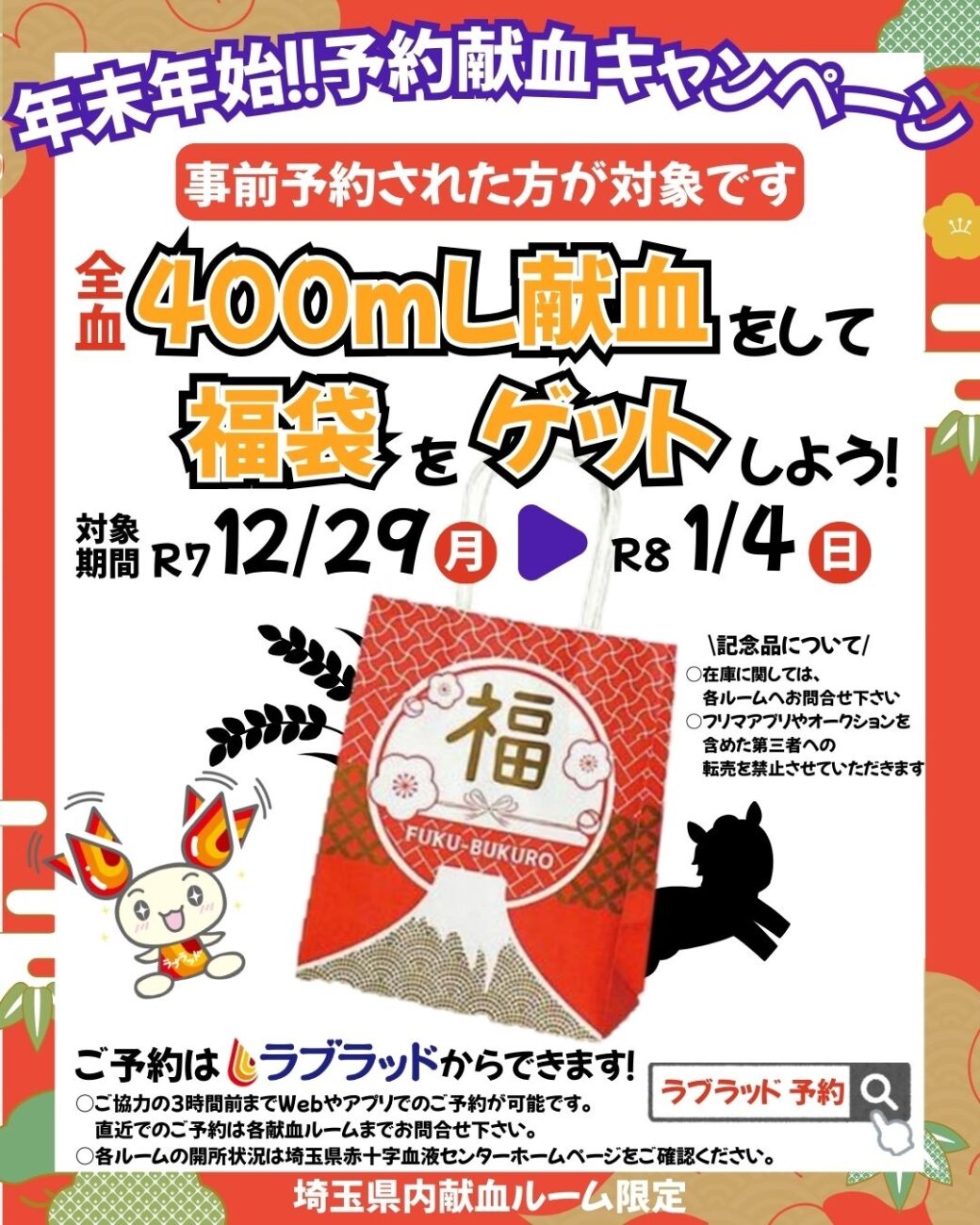 埼玉県内の献血ルームで「年末年始!予約献血キャンペーン」が開催されます。