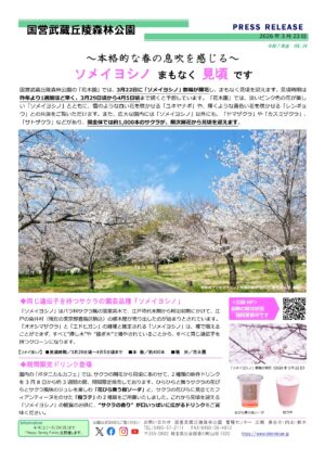 また、広大な園内には「ソメイヨシノ」以外にも、「ヤマザクラ」や「カスミザクラ」、「サトザクラ」などがあり、園全体では約1,000本のサクラが、順次開花から見頃を迎えます。