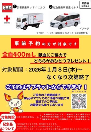 埼玉県内の献血ルームで「400mL予約献血で【オリジナルトミカ】プレゼントキャンペーン」が開催されます。