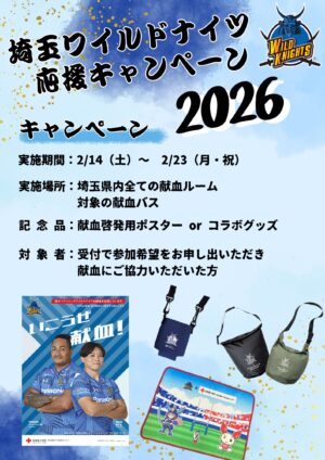 埼玉県内の献血ルームで「埼玉ワイルドナイツ応援キャンペーン2026」が開催されます。2026年2月14日~2月23日