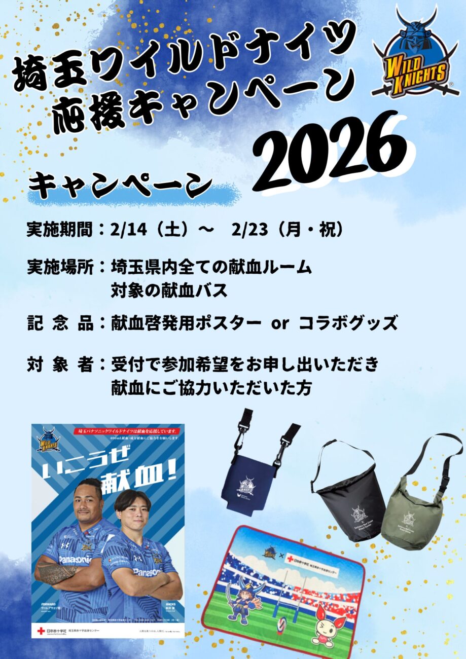 埼玉県内の献血ルームで「埼玉ワイルドナイツ応援キャンペーン2026」が開催されます。2026年2月14日~2月23日