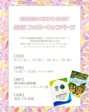 『2027年国際園芸博覧会~GREEN×EXPO~』『国営武蔵丘陵森林公園【公式】』の両方の SNS フォローが必要です。