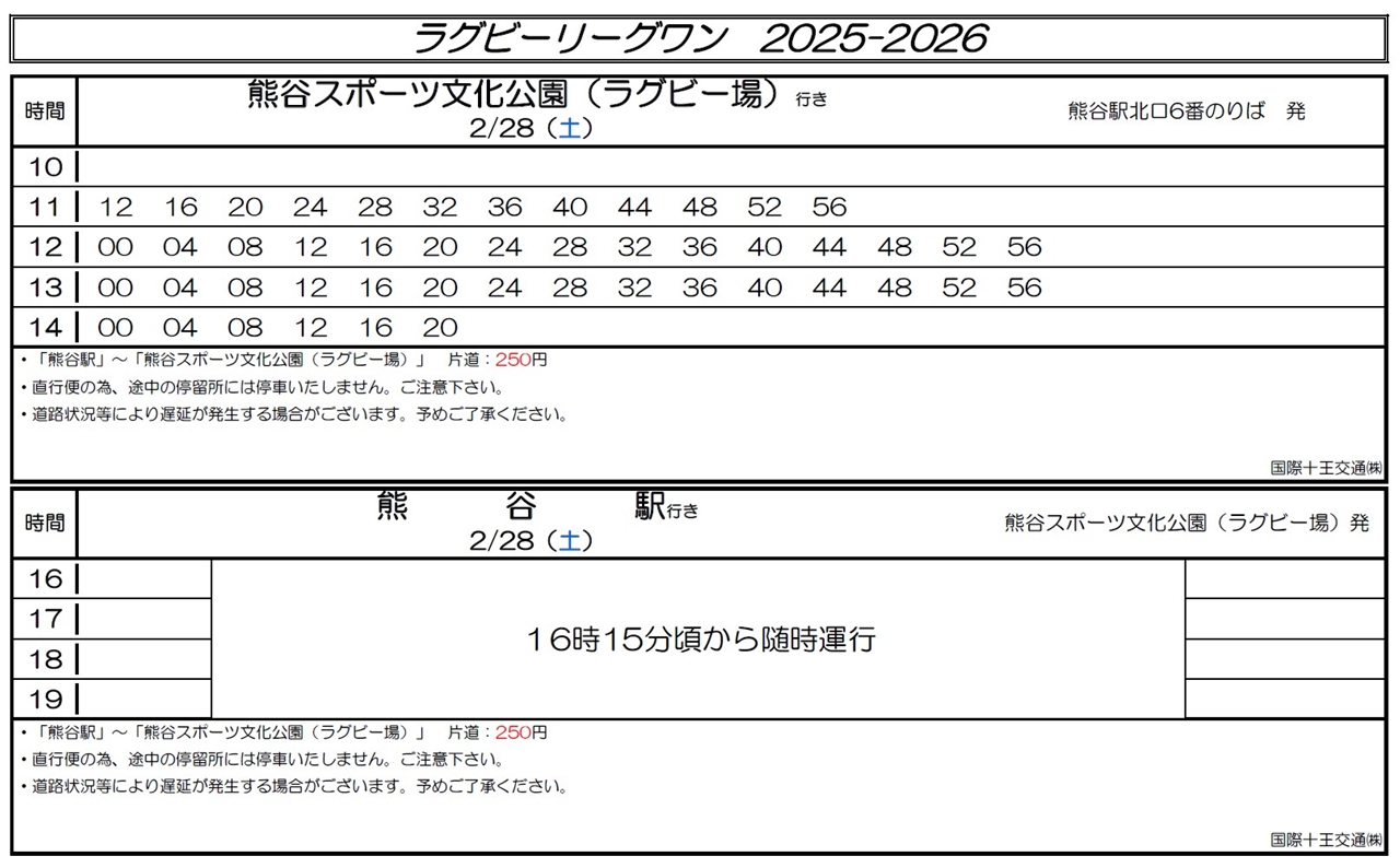 時刻表は以下をご確認ください。乗り場は「熊谷駅北口6番のりば」発です。